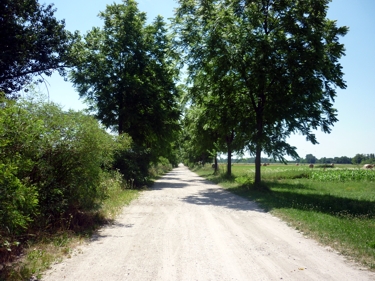 Ein schnurgerader Weg entlang der Deiche und Maisfelder.