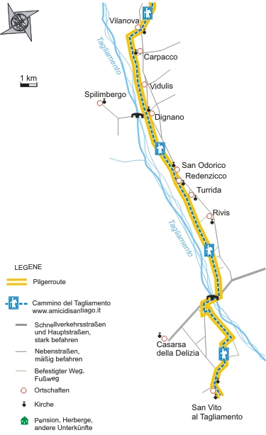 Auf dem linken Ufer des Tagliamento gehen wir durch die Dörfer Redenzicco, Turrida und Rivis.