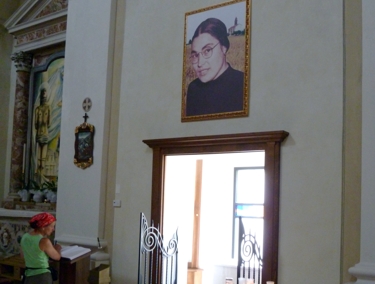 Der heilige Johannes Paul II. und Maria Bolognesi schauen sich von den Porträts an den Wänden der Kirche in Bosaro an.