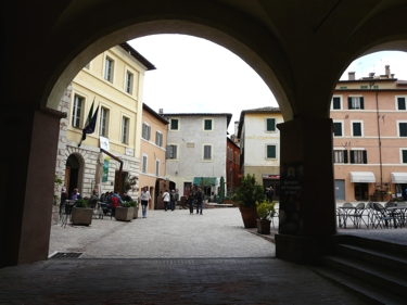 Die Piazza Mazzini, das lebhafte Zentrum von Trevi mit dem Palazzo Comunale, imposantem Stadtturm und malerischen Arkaden.